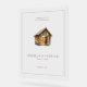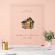 Dieses charmante Hochzeitsschild zeigt eine gemütliche, rustikale Illustration einer Blockhütte in warmen, erdigen Brauntönen und Orangetönen, die eine einladende Atmosphäre schafft. Das Design ist elegant mit viel Weißraum komponiert, wodurch die Hütte zum Mittelpunkt wird, während anpassbare Textfelder eine Personalisierung mit Namen, Daten und Orten ermöglichen. Die Typografie verwendet eine saubere Serif-Schriftart, die die whimsische Wasserfarben-Kunsttechnik ergänzt und ein Gefühl von Wärme und Gemütlichkeit hervorruft, das perfekt ist, um Liebe und Zusammengehörigkeit auf Ihrem besonderen Ereignis zu feiern.