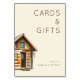 Dieses Hochzeitstisch-Schild zeigt auf der linken Seite eine charmante, rustikale Hüttenillustration, die in warmen, erdigen Tönen in Braun und Orange mit einer wasserfarbenartigen Textur dargestellt ist. Die rechte Seite zeigt eine elegante Serif-Typografie, die über einem herzlichen "Danke" "KARTEN & GESCHENKE" anzeigt und ein ausgewogenes und einladendes Layout schafft. Das Design strahlt ein gemütliches, verspieltes Thema aus, das perfekt geeignet ist, um sich bei Ihrem besonderen Ereignis zu bedanken, und sowohl die Wärme des Zuhauses als auch die Eleganz einer herzlichen Dankesbotschaft einfängt.