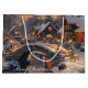 Eine Weihnachtsgeschenktüte mit einer Aquarellillustrierung eines sonnigen Dorfes an einem schneebedeckten Abend mit einem fließenden Fluss, der sich durch hell erleuchtete Hütten aus Stein und bezaubernde Steinbrücken mit sanften, leuchtenden Laternen schlängelt. Frohe Weihnachtsgrüße auf der Vorder-und Rückseite der Tasche angezeigt. Der Gruß kann nach Ihren Vorlieben geändert oder ganz entfernt werden.