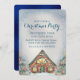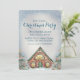 Diese individuelle Weihnachts- oder Feiertagseinladung besticht durch eine gemütliche und gemütliche Winterlandschaft. In der Mitte zwischen zwei verzierten Weihnachtsbäumen ist eine kleine, malerische Hütte abgebildet. Die Ornamente auf den Bäumen sind mit Imitaten goldenen Glitzer. Der Hintergrund zeichnet sich durch einen schönen fallenden Schnee aus.