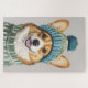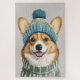 Eine herzliche Illustration eines fröhlichen Korgis mit einem gemütlichen Strickpulli und einer passenden blauen und grünen Mütze mit Pom-Pom. Die hellen Augen und der fröhliche Ausdruck machen dieses Bild zu einem perfekten Ort für Wintersportler und Liebhaber von Haustieren.