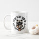 Eine warme, im Abzeichen gehaltene Illustration eines Waschbads in einer kleinen Barista-Schürze, die Kaffee neben einem Stapel offener Bücher gießt. Die Phrase "Bräunen lesen Wiederholen" steht oben, in freundlicher Blockschrift und einem kaffebräunlichen Farbton dargestellt. Flachvektor-Füllungen und knusprige Linien sorgen dafür, dass die Kunstwerke auf der Keramik klar gedruckt werden und vermitteln dabei gemütliche Lese- und Kaffeemaschine.