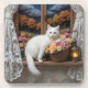 Dieses charmante und faszinierende Kunstwerk zeigt eine flauschige, weiße Katze, die auf einem Fensterbrett aus Nadelfilzen sitzt und an einem magischen Nachthimmel ausblickt. Die Katze, hergestellt aus weicher, weißer Wolle, mit auffallenden blauen Wolle- oder Glasperlenaugen, Erholungen unter zarten, schiere, weiße Spitzen-Vorhänge, gekonnt mit Nadel-Filz oder Filz Wolle auf luftige Stoffe. Der Fensterrahmen ähnelt dem Holz und enthüllt einen feuchten Hintergrund tiefer Blues und Purples mit zwei leuchtenden Monden, funkelnden Sternen und klauen Wolken - und schafft so eine traumhafte, himmlische Szene. Auf dem Fensterbrett dringt ein mit Nadel geklateter Korbkorb mit bunten Miniaturfarben in Rosa, Orangen und Gelb über, während eine warme, leuchtende Laterne in der Nähe steht. Im Freien vervollständigt eine Reihe von Herbstbäumen mit goldbraunem Blattwerk die gemütliche, romantische Atmosphäre. Das Kunstwerk ist sanft vignettiert und betont taktile Texturen, sanfte Wollmischung und eine skurrile, romantische Stimmung.