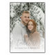 Diese Hochzeitstischkarte zeigt ein gemütliches Winterthema mit einem Foto von zwei Personen, die eng beieinander in einem schneebedeckten Wald stehen, umgeben von schneebedeckten immergrünen Bäumen. Das Design verwendet eine kühle Farbpalette aus Weiß- und Grautönen, kontrastiert mit warmen Tönen aus der Kleidung der abgebildeten Personen, wodurch eine intime und ruhige Atmosphäre entsteht. Elegante Schreibschrifttypografie hebt "Tisch 12" hervor, während einfache serifenlose Schrift Klarheit für Namen bietet und somit ideal für die Personalisierung Ihrer Hochzeitsfeier ist. Der realistische Darstellungsstil fängt die Schönheit einer winterlichen Landschaft ein, ideal, um Ihrer Feier einen Hauch von Natur hinzuzufügen.