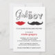 Ein niedliches, skurriles Geschlecht lädt mit einem schwarzen Schnurrbart und roten Lippen zur Babydusche ein. Auch mit dunklem Hintergrund erhältlich: