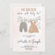 Gender reveal invitation card on marble surface. Features baby clothes and text "He or She, what will baby be?" Soft, neutral tones convey a joyous, anticipatory tone.