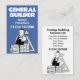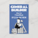 General Builder, Zuhause Reparaturen und Gebäude House Extensions Business Card. Personalisieren Sie Ihre Firmendaten. Hausbaukarte. Blauer Hintergrund. Illustration eines Bauers mit Gebäude-Steinen und anderen Gebäude-Vorräten.