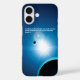 Ein stilisiertes Bild in Blautönen und Weiß der Erde und Mond, das von der Sonne beleuchtet wird. Eine englische Übersetzung von Genesis 1:4 mit dem Text "Gott sah, dass das Licht gut war, und Gott teilte das Licht von der Dunkelheit" erscheint auch in leuchtendem Blau und Weiß.