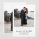 Moderne Foto Hochzeit speichern die Dattelkarte mit einem minimalen Schwarz-Weiß-Design mit Ihrem Lieblingsfoto. Im Folgenden finden Sie Ihre Veranstaltungsdetails in einer Kombination aus einfachen serifenlosen Sans-Schriftart und einem eleganten Skript. Dieses schicke Save the Date ist für jeden Hochzeitsstil bestens geeignet.