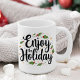 Elegante Schrift Weihnachtskaffee Tasse. Das Design enthält den Text "Enjoy The Holiday" in schwarzer Typografie mit schwarzem Stern und wirl Akzenten Elementen. Macht das personalisiertste Geschenk für sich selbst, Ihre Freunde, Familienmitglieder und sogar Nachbarn. Wir haben mehr als 35 Weihnachtskaffeemassen in unserer Sammlung, dass Sie definitiv Liebe. Bitte Karo es raus und bekommst das beste Weihnachtsgeschenk mit besonderen Wünschen für Ihre speziellen Leute. Frohe Weihnachten!