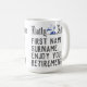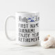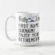 Ein Geschenk für jemanden, der in Rente geht. Altersgeschenk für einen Arbeitskollegen. Tasse der Rentenzahlungen. Zeitungsüberschrift Design. Personalisieren Sie mit dem Namen der Person, die in Rente geht. Genießen Sie Ihre Ruhestandsmeldung.