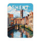 Gent Retro Vektor-Reise-Design. Gent ist bekannt für seine großen öffentlichen Plätze und Marktplätze, zu denen vor allem der Vrijdagmarkt (der "Freitagmarkt") gehört, der das Zentrum des mittelalterlichen Stadtlebens bildet.