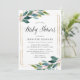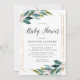 Stilvolle und elegante Babydusche mit Aquarellfarben-Blätter und Zweigen in kräftigen dunkelgrünen und aquamarinen Farbtönen. Ein atemberaubender Imitat mit vergoldetem Rahmen umschließt Ihre Babyduschdetails für ein Aussehen, das perfekt für Frühjahr- und Sommerduschen geeignet ist.