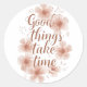 Embrace the gentle pace of life with this beautiful and encouraging message. The quote "Good things take time" is softly nestled among delicate, peach-colored blossoms, creating a serene and hopeful visual. It's a perfect, elegant reminder to trust the process and allow yourself to bloom in your own time.