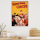 Gentry Bros, circus Miss Louise Hilton, the greatest rider the world has ever known. Circus poster showing Louise Hilton perched on white horse, about to leap over a scarf held by a clown and a ringmaster.