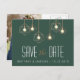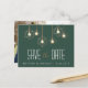 Eine atemberaubende moderne Save the Date Postkarte mit glühenden geometrischen hängenden Lichtern. Hintergrundfarbe kann besonders angefertigt werden, um Ihr Ereignisthema zusammenzubringen. Fügen Sie Ihr Foto der Rückseite der Karte für eine addierte persönliche Touch hinzu.