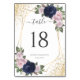 Elegante marineblaue und blütenblaue Tischnummer mit goldenem geometrischem Rahmen mit goldenen Konfetti und blauen und blütigen Blume und Grün. Matching-Elemente verfügbar.