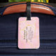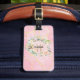 Hübscher monogramm Gepäckanhänger mit einem schönen Skriptnamen mit einem vergoldeten Initial, der durch eine zarte Aquarellgarland mit floraler Rose in Aquarellfarben auf einem rosa Geode-Hintergrundeffekt gerahmt ist. Entwickelt von Thisisnotme©