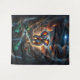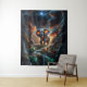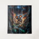 Eine surreale und fantastische Szene mit einem lebhaft bunten Elefanten, stehend inmitten einer felsigen, bergigen Landschaft. Der Elefant ist mit feinen, wirbelnden Mustern in hellen Blau-, Orange- und Rottönen geschmückt, was ihm ein weltliches Aussehen verleiht. Der Hintergrund hebt dramatische, wolkenverhangene Himmel mit einem kosmischen Element hervor, da oben ein sterniger Nachthimmel sichtbar ist.