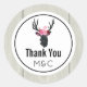 Eine Hochzeit Dankeschön Aufkleber mit einem schwarzen Hirschkopf aus geometrischen Linien und mit einer rosa Blumenkrone. Rustikales und trendiges Design. Der Hintergrund ist ein digitales Bild einer Holzstruktur. Personalisieren Sie Ihre Initialen.