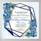 Geometrische Rahmen mit goldgelben Rahmen mit blauen Blume aus Mais, Weißrosen & Arumlilien, blauen Frühlingsblumen mit einem hellblauen Texturierungshintergrund für eine Frühjahr- oder Sommerhochzeit.