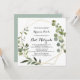 Diese geometrische goldene tropische Kalligrafie Fledermaus mitzvah Einladung ist perfekt für eine einfache Fledermaus Mitzvah. Das Design besticht durch handbemalte grüne Blätter, die einen goldenen geometrischen Rahmen schmücken.