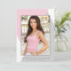 Diese Ankündigung des modernen Abschlusses weist ein rosa und graues geometrisches Muster auf. Das Foto des Absolventen's wurde in der Mitte hervorgehoben, und ihr Name unten.