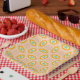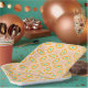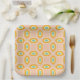 Geometric pattern featuring blue and orange diamond shapes on a peach background. The design creates a vibrant, symmetrical, and retro-inspired look.