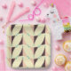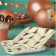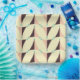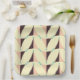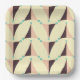 Geometric pattern with overlapping beige, peach, and brown triangles, accented by teal circles. The design forms a zigzag, creating a retro vibe.