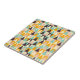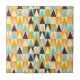 Geometric pattern of multi-colored triangles in teal, orange, cream, brown, and peach, arranged in a repetitive grid, conveying a modern, vibrant feel.