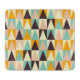 Geometric pattern of multi-colored triangles in teal, orange, cream, brown, and peach, arranged in a repetitive grid, conveying a modern, vibrant feel.