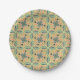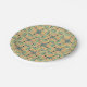 Top and angled views of a decorative plate featuring a geometric pattern with blue and green floral elements on a beige background, conveying a vintage feel.
