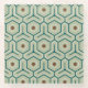Geometric pattern with interlocking hexagons in green and teal, featuring brown hexagons in the center. The design is symmetrical and retro-inspired.