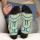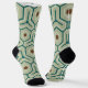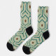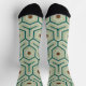 Geometric pattern with interlocking hexagons in green and teal, featuring brown hexagons in the center. The design is symmetrical and retro-inspired.