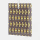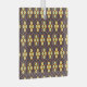 Repeating geometric pattern with orange and blue hexagons forming floral shapes on a dark background. The design conveys a retro, symmetrical feel.