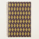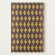 Repeating geometric pattern with orange and blue hexagons forming floral shapes on a dark background. The design conveys a retro, symmetrical feel.