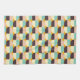 Geometric pattern with overlapping half-circles in teal, cream, brown, and peach on an orange background, creating a vibrant and retro feel.