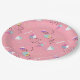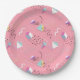 Das Fun Paper Party Teller Muster zeigt den Stil der 1990er Jahre mit abstrakten geometrischen Formen und Schnüren in den heißesten Farben des Jahrzehnts - alles auf einem rosa Hintergrund.