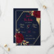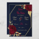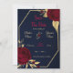Romantische bordeauxfarbene Blume und goldene Blätter auf geometrisch marineblaserblau Save the Date Einladung