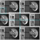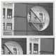 Stilvolles geometrisches Gewebe kennzeichnet eine Ziegelsteinwiederholung einer Architekturschwarzweiss-Fotografie. Der große offene Kreisschnitt in die Vordergrund-Betonmauer stoppte mich immer. Mit gerade dem rechtwinkligen der Ansicht durch das Kreisfenster, wurde der Zickzack der Feuerentweichentreppe des folgenden Gebäude sichtbar. Eine Sammlung hypnotisierende Geometrie wurde innen enthalten und den Kreis umgebend: Linien, Winkel, Quadrate, Rechtecke und Dreiecke.