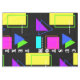 Geometrische Formen, Muster mit Dreiecken, Rechtecken, Quadraten und Linien. Dieser Retro-Funky 80er gemusterte Modedruck ist in leuchtend farbigen Neons - gelb, lila, pink blau und aqua. In einem Retrostil-Schriftart ist der benutzerdefinierte Text in weißer Farbe.