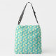 Ladys große Crossbody Bag in einem geometrischen Muster in türkis und gelb auf einem hellblauen Hintergrund. Die Primärfarben sind Türkis, Hellblau und Gelb.