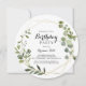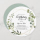 Diese geometrische goldene Tropenkalligrafie-Geburtstagsfeier lädt zu einem modernen Geburtstagsfest ein. Das Design besticht durch handbemalte grüne Blätter, die einen goldenen geometrischen Rahmen schmücken.
