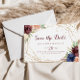 Diese geometrische Goldkalligrafie horizontalen Hochzeit speichern das Datum ist perfekt für eine rustikale Hochzeit. Das Design ist mit handgezeichnet Aquarell-lila, Marineblau, Rot, Bordeaux, Marineblau-Blume, grünen und goldenen Blätter, die einen eleganten geometrischen Rahmen schmücken.