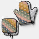 Dieses stilvolle Oven Mitt & Pot Holder Set besticht durch ein geometrisches, bohes Muster Vintager Sechseck-Formen in einer modernen Farbpalette aus Marineblau, Waldgrün, Rosa und Senfgelb.