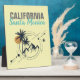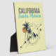 Die moderne Wortkunst zeigt Kalifornien im Not leidenden grauen Schriftart mit Santa Monica in einem modernen Aqua-Script-Schriftart mit geometrischen Palmen und Gebirgslogo-Stil Grafik auf hellgelbem Hintergrund