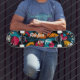 Dieses Skateboard-Deck zeichnet sich durch eine lebhafte Mischung geometrischer Pop-Kunst-Formen aus, mit den bestärkenden Mottos "Ride Fast" und "Live Free". Dieses hochenergetische Design ist perfekt für Skater, die Schnelligkeit und Freiheit schätzen, und verbindet kühne Farben mit urbanem Kunststil, um eine Aussage zu machen.