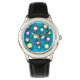 Diese Uhr hat ein geometrisches Design von Kreisen verschiedener Farben mit Linien, die auf einem Feld von blau kommen.