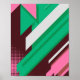 Das Design ist mit fett diagonalen geometrischen Formen in Smaragdgrün, Hellrosa und Weiß gestaltet und auf einem dunklen Maronhintergrund platziert. Der Hintergrund wird durch einen Farbverlauf mit rosa kreisförmigen Punkten bereichert, der allmählich verblasst, um Tiefe und einen inspirierten Pop-Kunst-Effekt zu erzeugen. Die scharf gekleideten Streifen und überlappenden Farben vermitteln ein Gefühl von Modernität, Bewegung und dynamischer Energie.