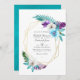 Türkisfarbene und lila tropische Blätter Hochzeitseinladung mit goldenem geometrischem Rahmen und eleganter Typografie. Der QR-Code auf der Rückseite führt zu Ihrer Hochzeitsstelle, wo die Menschen mehr und uAwg lernen können.